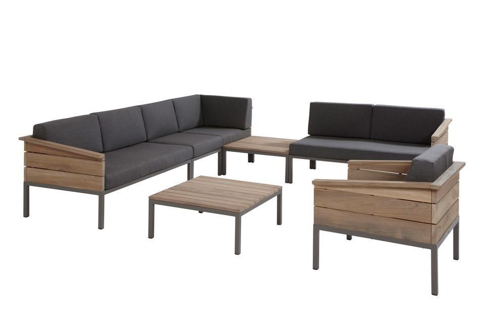 Cava Loungeset Modulair – Moderne warme stijl!Deze sfeervolle 4 Seasons Outdoor loungeset heeft een mooie natuurlijke kleur doordat ze gemaakt is van gecertificeerd teakhout, wat ervoor zorgt dat u unieke tuinmeubelen heeft. Het frame en de poten van deze loungeset zijn gemaakt van aluminium, wat mooi gepoedercoat is in antracietgrijs. De stevige kussens hebben een vormvaste vulling en zijn gemaakt van all-weather materiaal. Hierdoor zijn ze weerbestendig en blijven ze mooi in vorm.De Cava Loungeset bestaat uit:1x Lounge- Element 2-zit Rechts – 145(l) x 80(d) x 82(h) cm, 1x Lounge- Element 2-zit Links – 145(l) x 80(d) x 82(h) cm, 1x Hoekelement – 80(l) x 80(d) x 82(h) cm, 1x Loungestoel – 76(l) x 80(d) x 82(h) cm, 2x Koffietafel – 78(l) x 78(d) x 32(h) cm, 7x Rugkussen – 4x Zitkussen