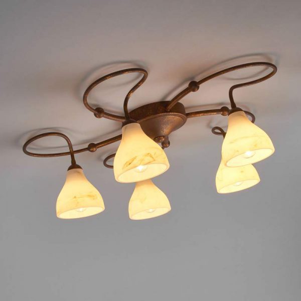 5-lichts plafondlamp Mattia brengt de flair van een landhuis mee De gebogen armen van de plafondlamp in antiek bruin geven levendigheid aan plafondlamp Mattia. De lampenkappen zijn gemaakt van crèmekleurig, gesatineerd glas met mooie veegoptiek en harmoniëren perfect met de antieke finish van de armatuur. Mattia – een kwalitatief hoogwaardige plafondlamp voor de landhuisstijl – made in Italy. Energie-klasse: A++