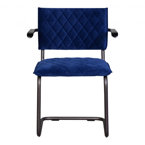 Geef kleur aan je interieur met eetkamerstoel Marilia. De moderne armstoel heeft een metalen frame in mat zwart met afgeronde lijnen. De zitting en rug zijn bekleed met zachte fluwelen stof in de kleur inktblauw met diamantstikking. Een stoel met een stijlvolle en kleurrijke uitstraling, die past binnen diverse interieurstijlen.