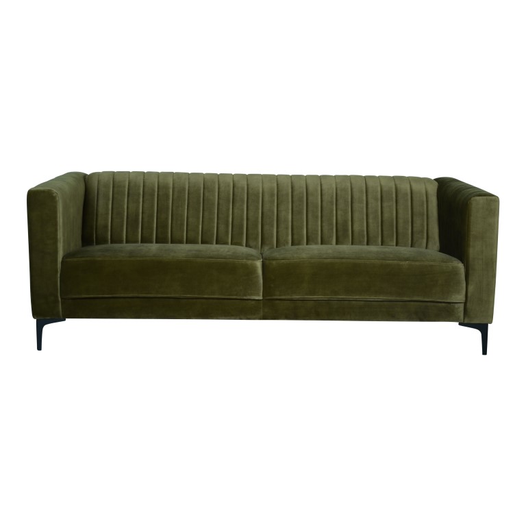Bank Reina is met de fluwelen bekleding Adore in de kleur mosgroen een trendy meubel voor het interieur van de woonkamer. De bank heeft een moderne uitstraling met een vintage vibe, omdat de armen in de rug doorlopen. De stoere stiksels in de fluwelen stof en de hoge zwart metalen poten maken het plaatje compleet.