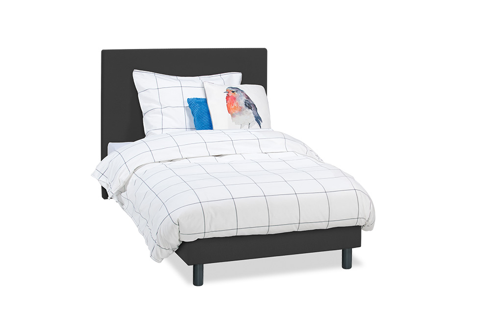 Boxspring Colorado Vlak Aspen Met Polyether Matras Beddenreus. Deze modern vormgegeven box bestaat uit een vlakke box met een verende lattenbodem en antraciet poten. Inclusief hoofdbord en een Bridge matras. Het hoofdbord is strak vormgegeven. Het matras Bridge is een polyether matras SG24 met een hoogte van circa 12 cm en geschikt voor personen tot 80 kg. Kijk ook eens naar de bijpassende hocker.