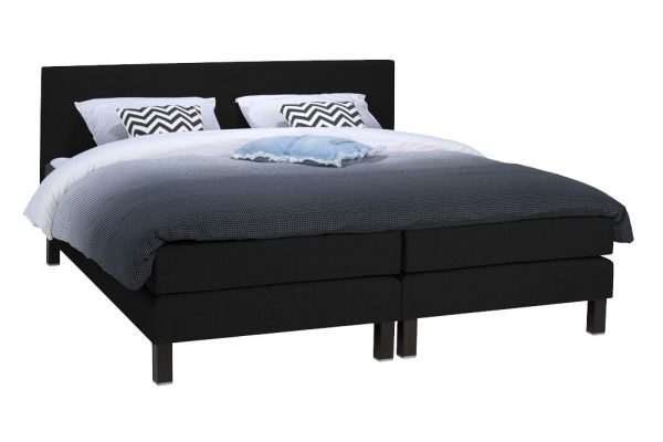 Boxspring Connecticut Vlak Met Gestoffeerd Matras Beddenreus. De Connecticut box heeft een gemeleerde stof (of effen zwart). De box heeft verende latten, een modern hoofdbord, gestoffeerde matrassen en wordt geleverd inclusief topdekmatras. De poten zijn afgewerkt met een zilverkleurig randje.