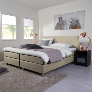 Boxspring Embla Verstelbaar Met Pocketveer Matras Beddenreus. De Embla is een bed om heerlijk in weg te dromen. Deze comfortabele boxspringcombinatie bestaat uit twee elektrisch verstelbare boxsprings en een hoofdbord. Het pocketveermatras (2stuks) telt ongeveer 236 veren per m2 en heeft 7 comfortzones. De kern is afgedekt met 2,5 cm traagschuim SG50 voor een drukverlagend ligcomfort.