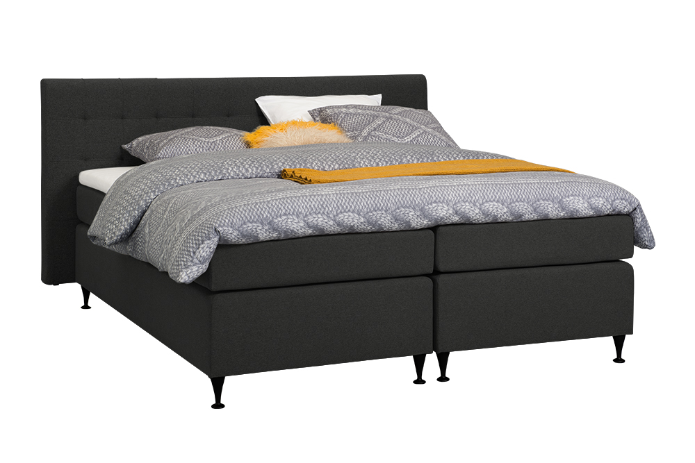 Boxspring Helsingborg Vlak Met Gestoffeerd Matras Nordland. Ervaar het echte Scandanavische slaapcomfort met de Helsingborg vlak met gestoffeerd matras. Deze moderne boxspring combinatie uit de Nordland collectie bestaat uit twee vlakke bonell boxsprings, bonell matrassen, topper en heeft een Helsingborg hoofdbord. Bij de uitvoering van 140 cm breed zit een 2-persoons matras. De uitvoeringen van 160 cm en breder hebben twee 1- persoons matrassen. Deze boxspring combinatie is uitgevoerd met zwarte Conico poten.