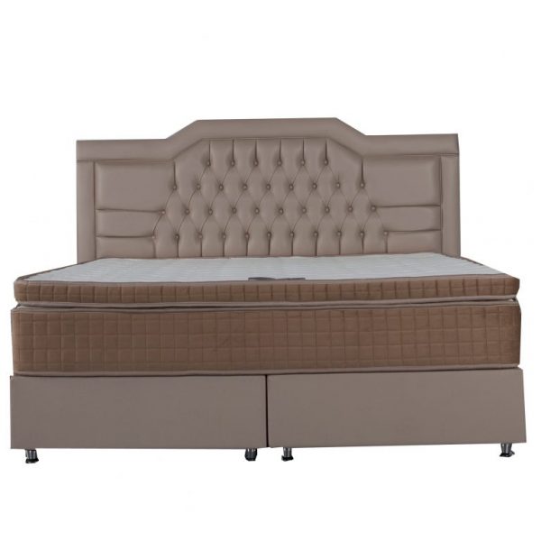 Slapen als in een Luxe 5 Sterren Hotel! Deze boxspring gaat de vergelijking met een hotel.bed beslist niet uit de weg!! Deze combinatie bestaat uit 2 vaste hotel-boxen van 35 cm. hoog die rusten op stevige poten. Het hoge, luxe, met knopen gecapitonneerde hoofdbord, steekt aan weerszijden 10 cm uit. De totale hoogte van het hoofbord is 140 cm en de dikte ervan is 5 cm. De 2 meegestoffeerde binnenveringsmatrassen zijn vervaardigd uit 150 stuks 5-slags bonnell veren per m2 en hebben 5 zones, die afgedekt zijn met luxury foam. De matrassen hebben een hoogte van 25 cm en zijn voorzien van luxe dubbeldoek met sierstepping. Daarboven ligt nog eens een oplegmatras van 8 cm dik luxury foam. Omdat de matrassen redelijk zwaar zijn om te tillen, zijn ze voorzien van stevige handvaten. Je hebt bij de boxspring de keuze uit 3 verschillende maten in 3 verschillende kleuren platgeweven weefstof in combinatie met een bijpassende kleur leatherlook. Heb je vragen over andere afmetingen of stoffen,