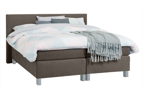 Boxspring Sandviken Vlak Met Gestoffeerd Matras Nordland. Ervaar het echte Scandinavische slaapcomfort met de Sandviken vlak met gestoffeerd matras. De moderne boxspring combinatie uit de Nordland collectie bestaat uit twee vlakke bonell boxsprings, gestoffeerde bonellveer matrassen, topper en heeft een Sandviken hoofdbord. Bij de uitvoering van 140 cm breed zit een 2-persoons matras. De uitvoeringen van 160 cm en breder hebben twee 1-persoons matrassen. Deze boxspring combinatie is uitgevoerd met zilver-rvs kleur Quadro poten.