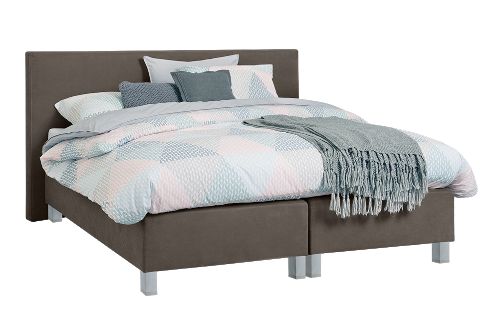 Boxspring Sandviken Vlak Met Pocketveer Matras Nordland. De moderne boxspring combinatie uit de Nordland collectie bestaat uit twee vlakke bonell boxsprings, pocketveer matrassen en heeft een Sandviken hoofdbord. Ervaar het echte Scandinavische slaapcomfort! Bij de uitvoering van 140 cm breed zit een 2-persoons matras. De uitvoering van 160 cm en breder hebben 2 een persoons matrassen. Deze boxspring combinatie is uitgevoerd met zilver-rvs kleur Quadro poten.