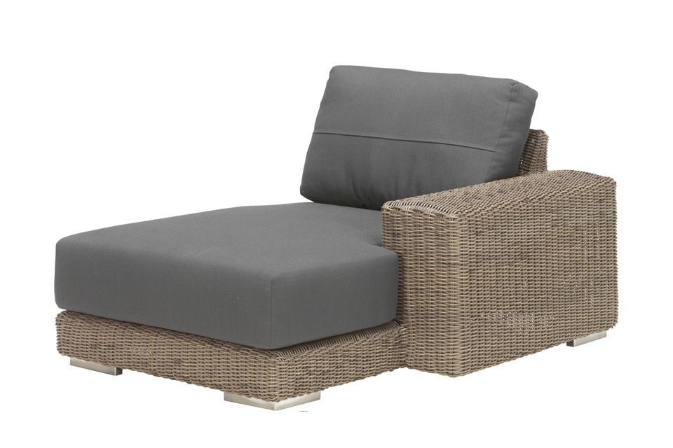 Deze chaise longue links is een module van de Kingston loungeset, die het ultieme comfort biedt op het gebied van loungen. Deze 4 Seasons Outdoor loungeset heeft royale afmetingen en een robuust uiterlijk wat strak is vormgegeven en toch klassiek oogt door het naturel wicker waar deze royale loungeset van gemaakt is. De kussens zijn uiterst comfortabel en hebben een opvallend detail door de bies die over het kussen loopt. Wilt u liever een rustiger stijl? Dan draait u het kussen om en heeft u een effen zijde. De Kingston loungeset is door de losse elementen zoals deze chaise longue op talloze manieren samen te stellen.