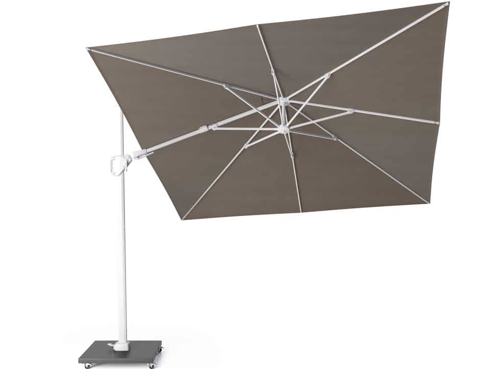Zweefparasol Challenger T² 3?3 van Platinum. Dubbel kantelbare zweefparasol met wit frame. 360 graden draaibaar. Uitgevoerd in Havana spuncrylic. Uitgevoerd met een witte mast.