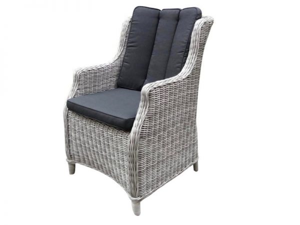 De Darwin Rattan stoel bestaat uit:Darwin Rattan stoel van 75 x 62 x 95H cm.6 mm volledig rond Naturel white Grey vlechtwerk.Dark grey zit- en rugkussen.2 jaar garantie