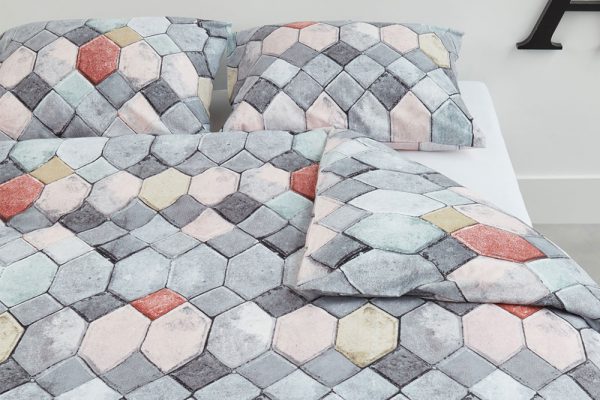 Dekbedovertrek Go At Home With Marieke. Dekbedovertrek Go is opgebouwd uit tegels in verschillende kleuren en groottes. Het dekbedovertrek is opgebouwd uit grijstinten gecombineerd met zachtblauw, zachtgroen, nude, vergrijsd oker en terra-accenten. Het dekbedovertrek is gemaakt van een zeer zachte 100% katoen. Het dekbedovertrek heeft een open dubbele instopstrook over de gehele breedte aan beide zijden. Het dekbedovertrek is inclusief instopstrook 240cm lang.