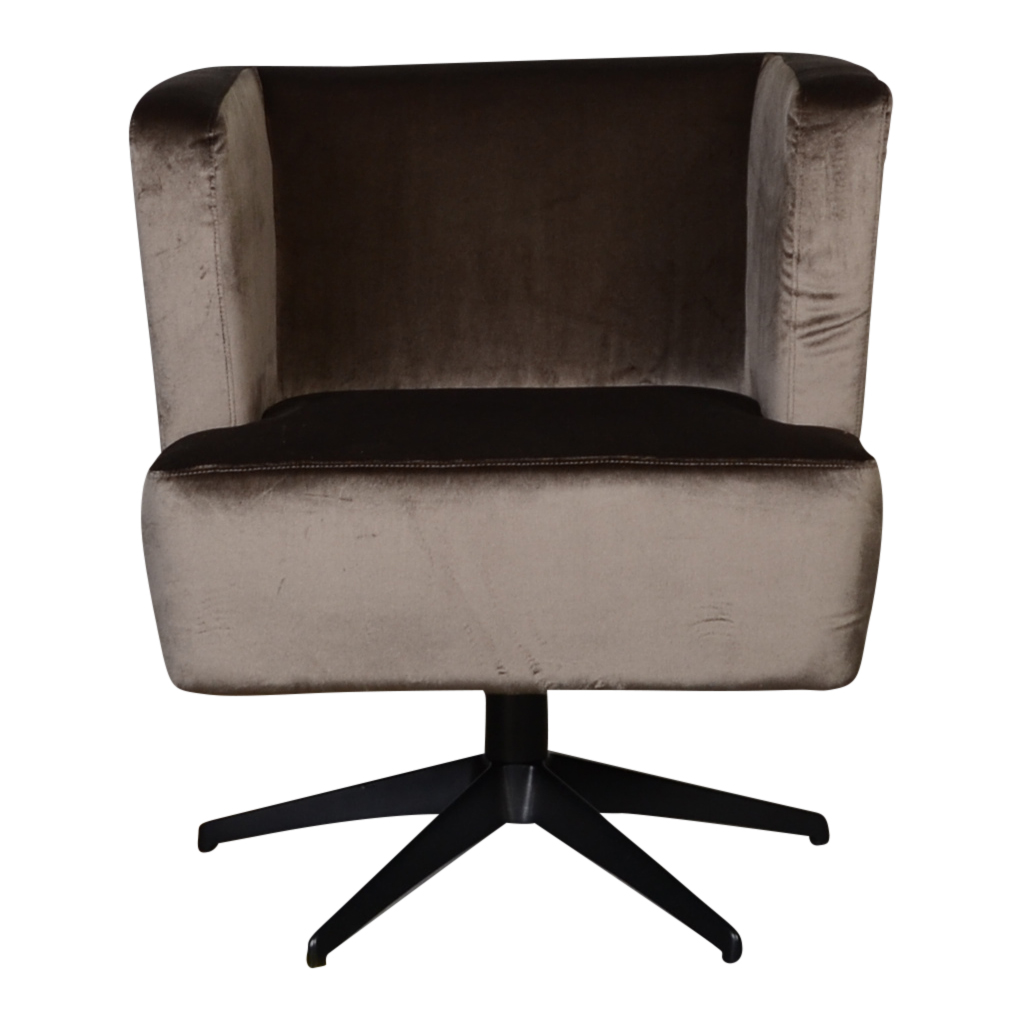 Draaifauteuil Nena is een meubel met klasse. De combinatie van het zwart metalen onderstel en bekleding in de zachte fluwelen stof Teatro in de kleur major brown maakt de fauteuil tot een opvallend item in je woonkamer. De armen zijn even hoog als de rug en dat geeft de draaifauteuil een luxe look.
