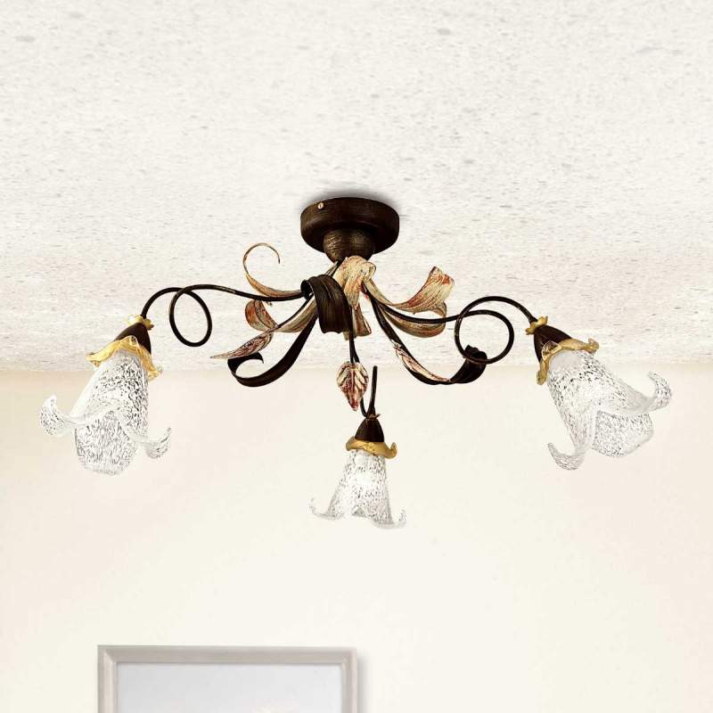 Speelse plafondlamp Giuseppe in Florentijnse stijl Plafondlamp Giuseppe bekoort door haar vele details uit de bloemenwereld. De armatuur is versierd met een aantal goudkleurige blaadjes, de armen van de plafondlamp zijn verstrengeld zoals de sierlijke takken van een jonge boom en de lampenkappen van glas zien er uit als bloemen. Made in Italy. Energie-klasse: A++