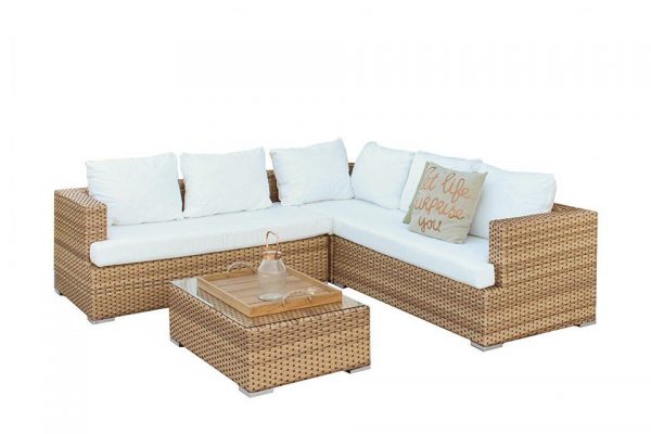 Loungeset Hoekbank Monaco -, Natuurlijke en pittige uitstraling in wicker!De Monaco Loungeset uit de Fonteyn eigen collectie heeft een pittige en natuurlijke uitstraling door het natuurlijke kleur wicker in combinatie met de frisse witte kussens. Deze loungeset wordt geleverd met een gratis kussenhoezenset in antracietgrijs!De Monaco Loungeset bestaat uit:1x Lounge- Element 2-zits links – 154(l) x 85(d) x 70(h) cm, 1x Lounge- Element 2-zits rechts – 156(l) x 84(d) x 70(h) cm, 1x Hoekelement – 84(l) x 84(d) x 70(h) cm, 1x Koffietafel: 94(l) x 64(d) x 33(h) cm, 6x Rug-Armkussen – 3x Zitkussen – 1x Glasplaat Hoe onderhoud ik vlechtwerk?