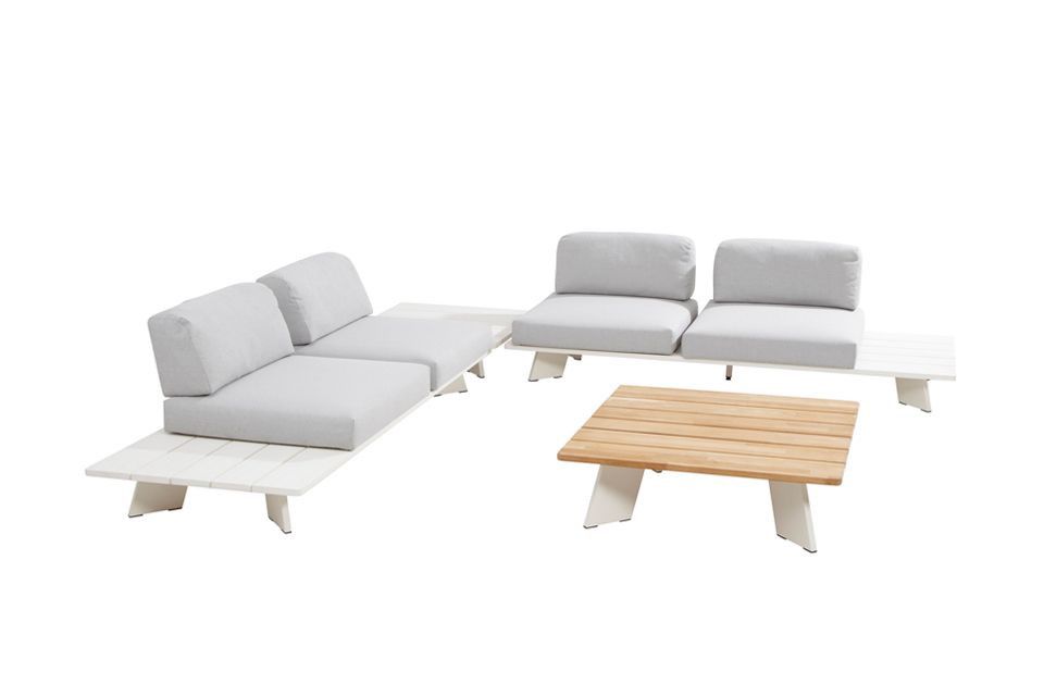 Omnia loungeset – Minimalistisch modern!De Omnia loungeset heeft een frame van aluminium met witte poedercoating, waardoor deze loungeset duurzaam en weerbestendig is. De kussens zijn gemaakt van all-weather materiaal, zodat ze weerbestendig zijn en lang mooi blijven.De Omnia Loungeset bestaat uit:2x Lounge- Element 2-zits links/rechts – 220(l) x 86(d) x 66(h) cm, 1x Koffietafel Aluminium – 86(l) x 86(d) x 21(h) cm, 1x Koffietafel Aluminium met Teakhout – 100(l) x 100(d) x 30(h) cm, 4x Rugkussen – 4x Zitkussen