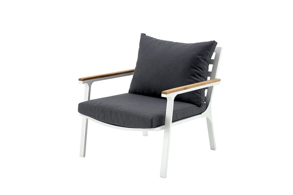 Klara Loungestoel – Fris modern design!De Klara loungestoel heeft een frisse uitstraling door het hoogwaardige aluminium waar deze moderne tuinstoel van gemaakt is met witte poedercoating. Het aluminium zorgt ervoor dat deze loungestoel stevig, licht van gewicht en onderhoudsvriendelijk is. De armleuningen van teakhout geven een mooie natuurlijke twist aan de stijl van de Klara living chair. Het zitkussen in antracietgrijs geeft een mooi contrast tegen het wit van het aluminium en heeft een prettig zitcomfort door de stevige vulling.De Klara loungestoel bestaat uit:1x Loungestoel – 73(l) x 80(d) x 77(h) cm, 1x Zitkussen – 1x Rugkussen