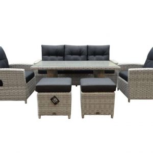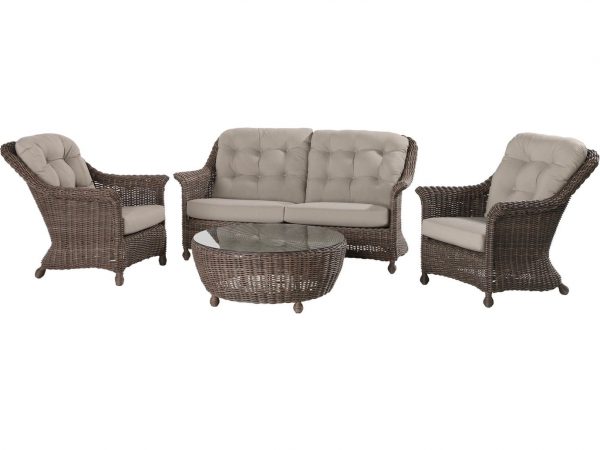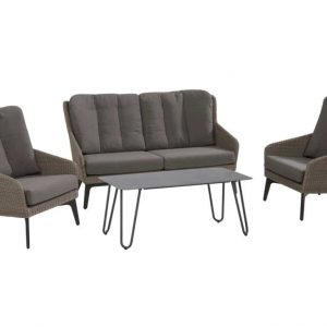 De Madoera loungeset van 4SO bestaat uit:2x Madoera loungestoel1x Madoera 2,5-zitsbank1x Madoera koffietafel 100 x 40cm?cm + glas7mm volledig rond vlechtwerk Colonialall weather kussens10 jaar garantieGRATIS THUISBEZORGD