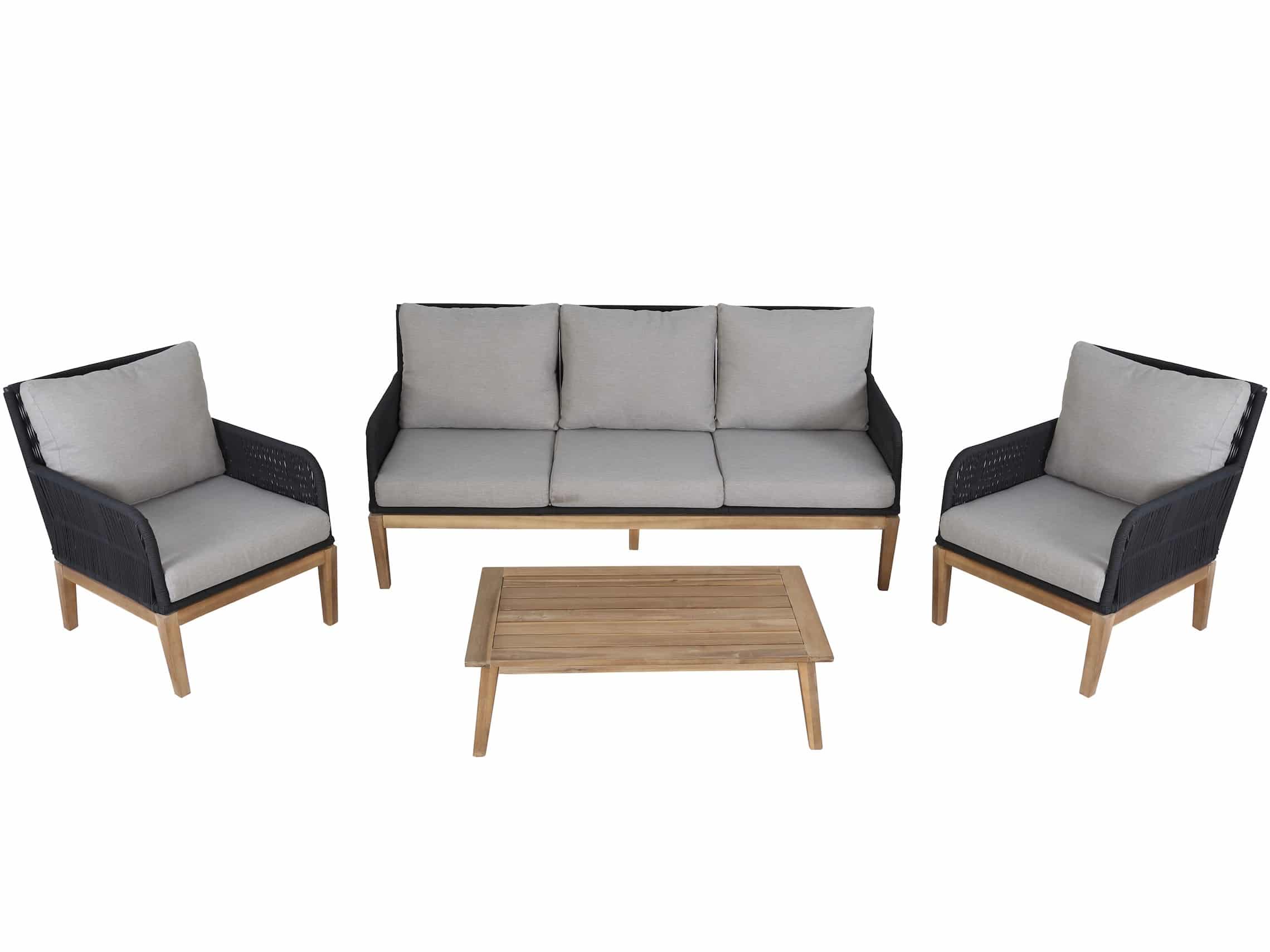 De Montevideo stoel bank loungeset is van het merk AVH-Collectie. De stoel bank loungeset heeft een frame van acacia hardhout uit Vietnam. De loungeset is verder voorzien van rope. Dit touw geeft een luchtige en tegelijk een degelijke uitstraling. Rope kan altijd buiten blijven staan in weer en wind.De Montevideo loungeset bestaat uit een 3-zitbank, 2 lounge stoelen een een houten lounge tafel. De extra dikke kussens zijn afritsbaar en wasbaar op 30 graden.De afmetingen van de bank: 79x185xH86 cmDe afmetingen van de stoel: 79x66xH86 cmDe afmetingen van de tafel: 100x60xH31 cmWij geven 2 jaar garantie op de Montevideo loungeset.