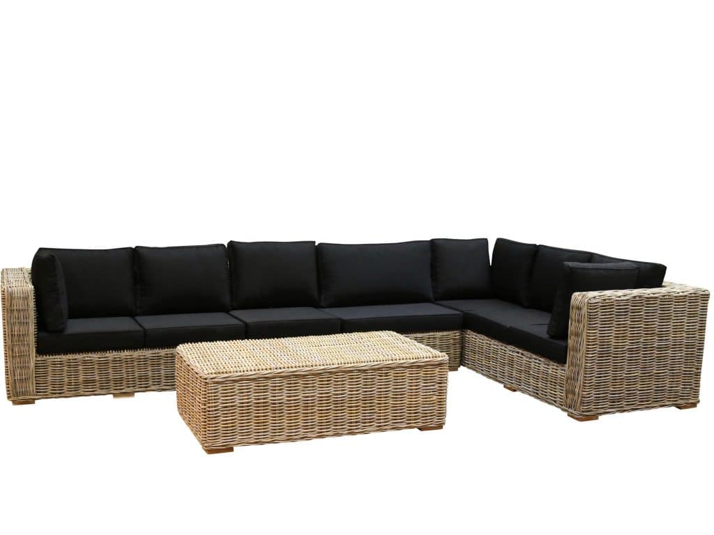 De Nissah hoek loungeset is een loungeset gemaakt van natuurlijk rotan. Door het gebruik van volledig ronde draden oogt de Nissah set erg robuust. Het frame is gemaakt van hardhout. De kussens zijn van polyester gemaakt. De kussens zijn afritsbaar en wasbaar. De Nissah loungeset staat op teakhouten poten. De Nissah hoek loungeset bestaat uit een 3-zitsbank, een open 3-zitsbank, een middenelement en een lounge tafel. De Nissah hoek loungeset is ook in spiegelbeeld leverbaar. Wij geven 2 jaar garantie op de Nissah loungeset.