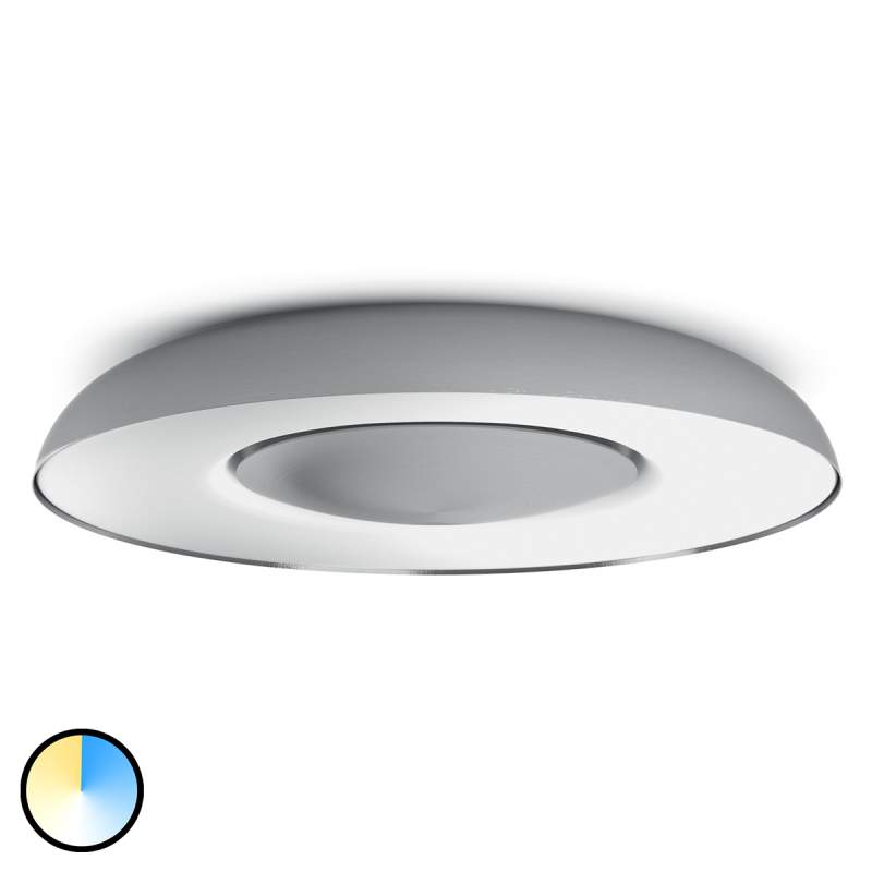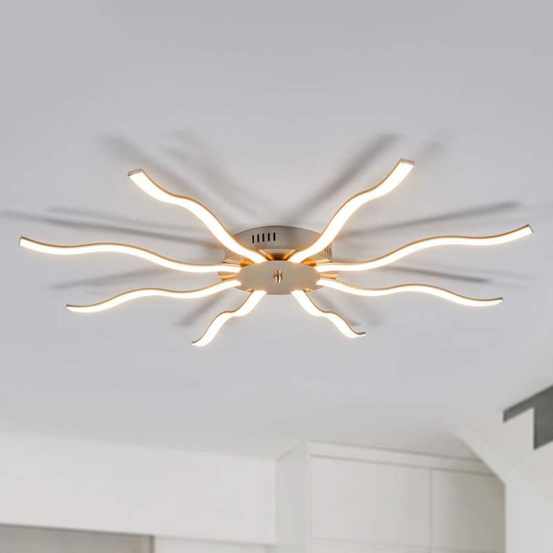LEDplafondlamp Stefania met zes lampjes en romantische uitstraling en easydim-technologie Stefania is een LED plafondlamp die onmiskenbaar een romantische look heeft en dankzij het witte glas voor mooie gelijkmatige verlichting zorgt. De lampenarmen zijn romantisch gebogen en zijn verrijkt met een metalen decoratie in bladvorm. Bovendien is de zwarte oppervlakte van het montuur voorzien van zachte penseelstrepen, wat prima bij het gehele design past. Om de LED plafondlamp te dimmen zijn er geen extra accessoires nodig, maar kan in plaats daarvan de schakelaar aan de muur worden gebruikt. Als de lamp is ingeschakeld, dient het om te kunnen dimmen snel (in minder dan twee seconden) uit- en dan weer aan te worden geschakeld. Dan reduceert de helderheid naar 10%, of het dimproces stopt op het punt waar het schakelproces weer wordt herhaald, om een bepaalde intensiteit vast te leggen. Energie-klasse: A+