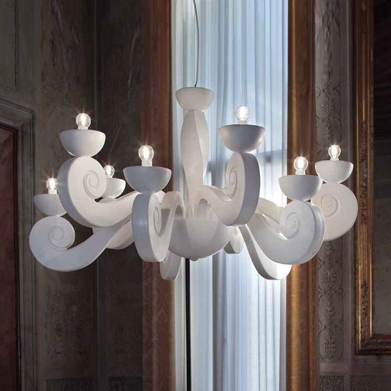 Elegantie treft moderniteit – 6-lamps kroonluchter Intreccio Kroonluchter Intreccio onderscheidt zich niet alleen door zijn fraaie vorm, maar is ook door zijn stijlvolle kleuren een onmiskenbare highlight en stijlvol meubelelement. Zes sneeuwwitte textiele kappen zorgen voor een zachte lichtverdeling en een verblindingsvrije verlichtingssfeer. De kroonluchter is bijzonder stijlvol vanwege de smalle metalen lussen, die dankzij hun gouden kleur en de opvallende vorm prachtig bij het sneeuwwitte armatuur passen en het design een nog luxueuzere uitstraling geven. Energie-klasse: A++