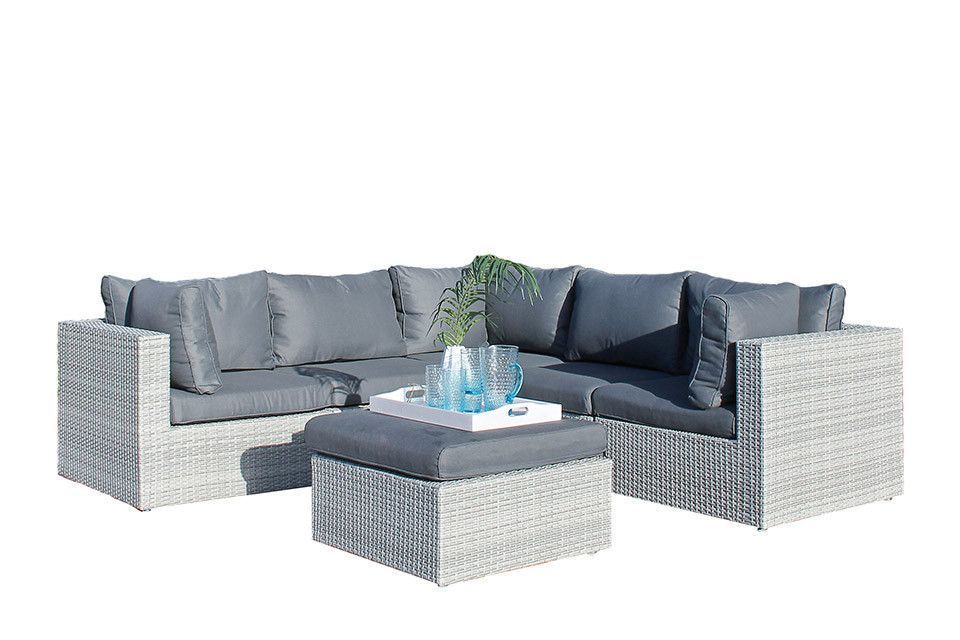 Loungeset Hoekbank Alicante -, Strakke en tijdloze uitstraling!De Alicante Loungeset is gemaakt van hoogwaardig wicker in de kleur white grey. Deze loungeset bestaat uit losse elementen met een royale zitting en stevige waterafstotende kussens. Breidt de Alicante loungeset uit met de verschillende los verkrijgbare elementen en creer uw eigen sfeer!Deze Alicante Loungeset bestaat uit:3x Hoekelement – 85(l) x 85(d) x 67(h) cm, 2x Tussenelement – 70(l) x 85(d) x 67(h) cm, 1x Voetenbank – 72(l) x 72(d) x 45(h) cm, 8x Rug/Armkussen – 5x Zitkussen – 1x Voetenbankkussen