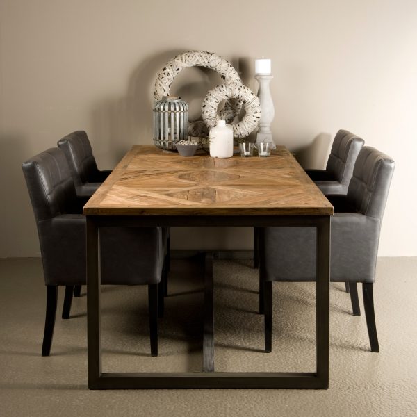 Gerecycled oud teak met een lichte white wash, donker geborsteld metaal