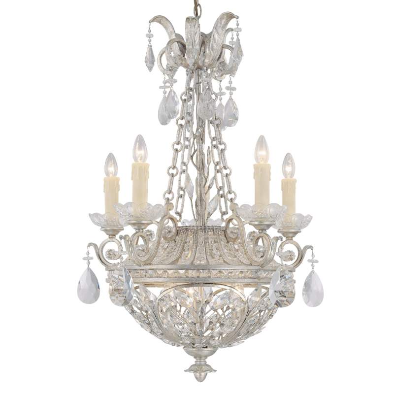 Fraaie 6-lichts kroonluchter SHEREZADE Deze kroonluchter, ontworpen door Federico Martinez is qua gratie en elegantie nauwelijks te overtreffen. Aan het metalen frame dat een sublieme zilveren look heeft, zijn middelgrote kristalelementen aangebracht. Aan deze basis zijn aan de buitenzijde slanke kristallen kettingen bevestigd die vanuit de kleine bovenste ring naar de grote ring beneden lopen. Daarvandaan lopen ze door naar het onderste centrale punt. De buitengewoon mooie vormgeving van het bovenste deel maakt het totaalbeeld volmaakt. Kroonluchter SHEREZADE doet door zijn adembenemende vormgeving denken aan de verhalen uit “Duizend en één Nacht”. SHEREZADE is geschikt voor spaarlampen en straalt betoverend licht uit met 6 lichtbronnen in een mooie kaarsenhouder op een kristallen schoteltje. Energie-klasse: A++